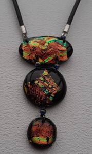 2020zwarte ondergrond met herfstkleurige dichro. Met glaskraaltjes aan elkaar geknoopt. Heel mooie glans die op de foto niet goed tot zijn recht komt.